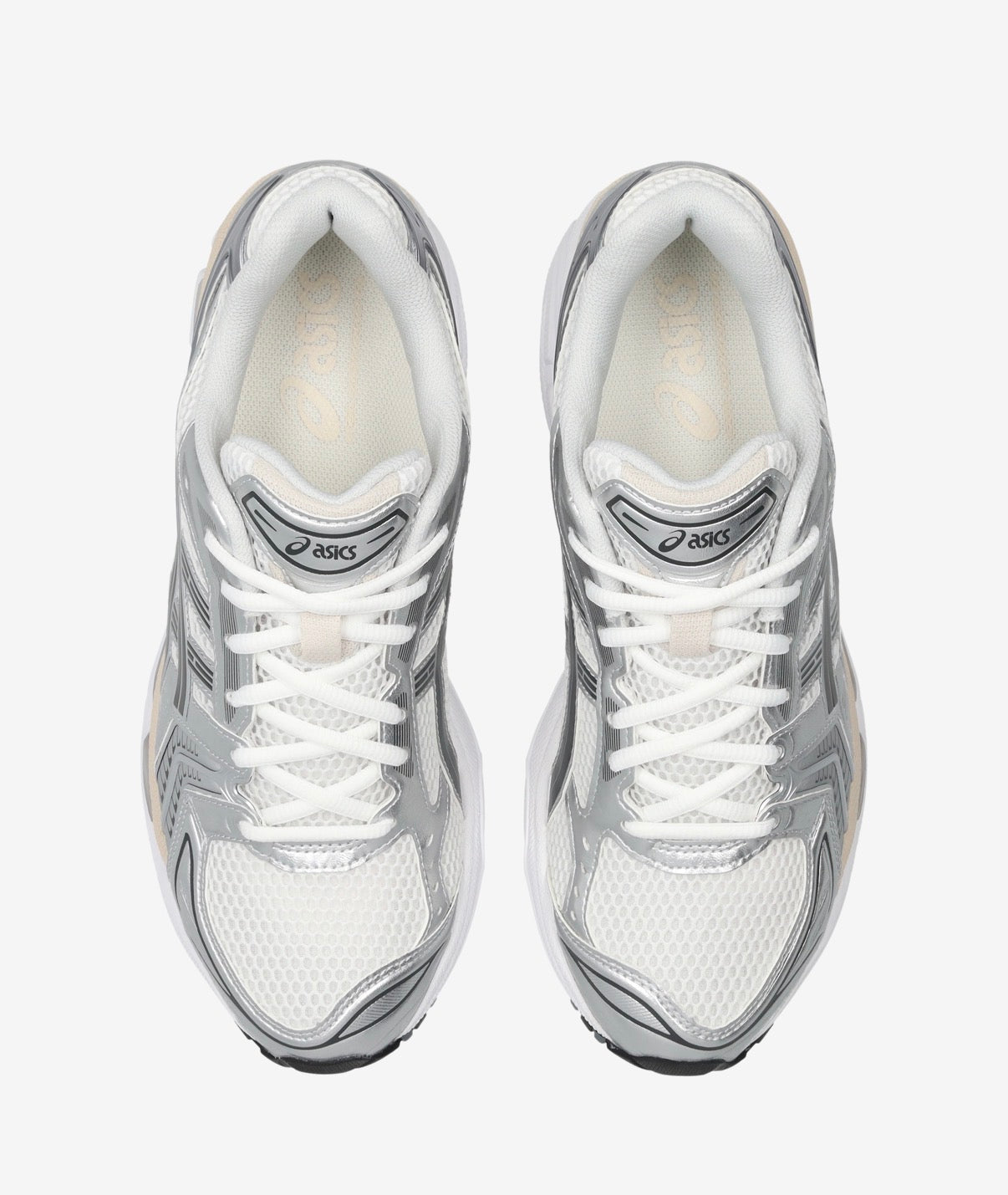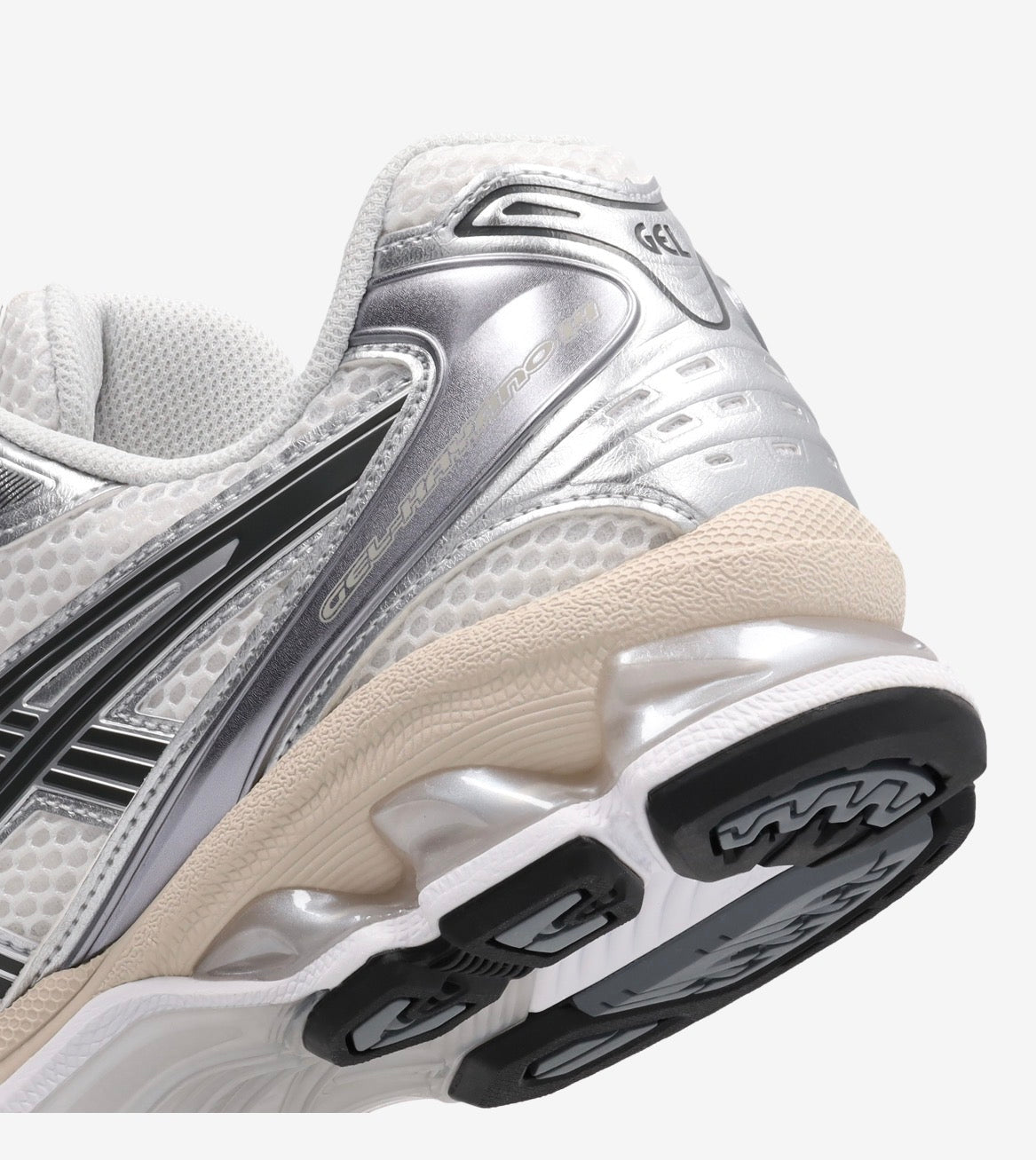 Originally released in 2008, the GEL-KAYANO 14 was the first of the series to be designed by someone other than Toshikazu Kayano. Wide, breathable white mesh is layered with 'Graphite Grey' and silver leather panelling, a nod to a late 2000s aesthetic, while metallic accents flash across the silhouette, adding a luxe finish. Below, visible GEL technology and a TRUSSTIC support system offer advanced impact absorption and cushioning.